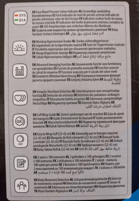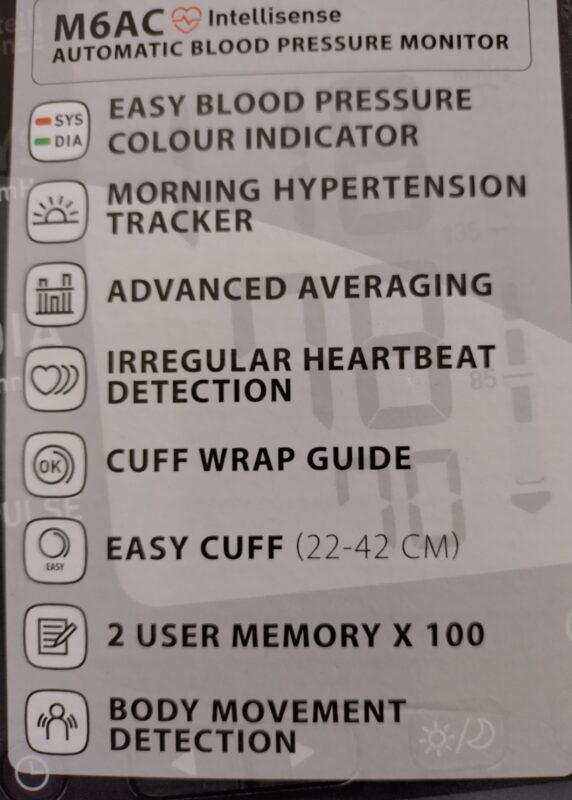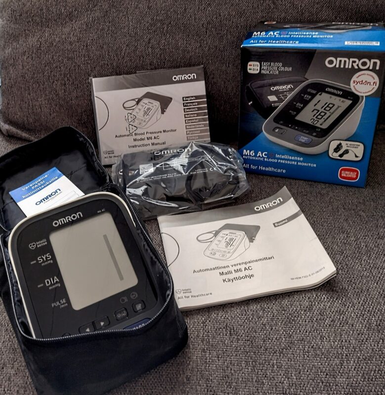 Mittaustulos on entistäkin helpommin tulkittavissa. M6 AC kertoo verenpaineen tarkasti ja luotettavasti. Tarkka tulos saadaan suurikokoiselle näytölle yhdellä napin painalluksella ja tulos on helposti tulkittavissa! Näytölle syttyy joko vihreä tai punainen valo ylä- ja alapaineen tason mukaisesti (kotimittauksessa tavoitearvo on 135/85). Mittarissa on sadan mittauksen muisti kahdelle käyttäjälle ja uutena ominaisuutena on viikon aamu- ja iltamittausten keskiarvojen tarkastelu: M6 AC ilmoittaa viikoittaiset aamu- ja ilta- mittaustulosten keskiarvot kahdeksan viikon ajalta. Mittari ilmoittaa selkeästi OK-valolla, että mansetti on oikein kiinnitetty ja mittaus on onnistunut. Intellisense-teknologian ansiosta mittari pumppaa mansettiin ilmaa vain sen verran kuin tarvitaan, joten mittaus on aina nopea, miellyttävä ja kivuton. OMRON-verenpainemittarit ovat luotettavia sillä ne ovat kliinisesti validoituja eli lääketieteen ammattilaisten testaamia ja hyväksymiä. OMRON M6 AC -mallissa on 100 mittauksen muisti kahdelle käyttäjälle. Mittari ilmoittaa epäsäännöllisestä sykkeestä ja liiallisesta liikkumisesta mittauksen aikana. Se laskee automaattisesti viimeisten mittaustulosten keskiarvon. (teksti lainattu Prisman verkkosivulta: https://www.prisma.fi/fi/prisma/omron-m6-ac-verenpainemittari )